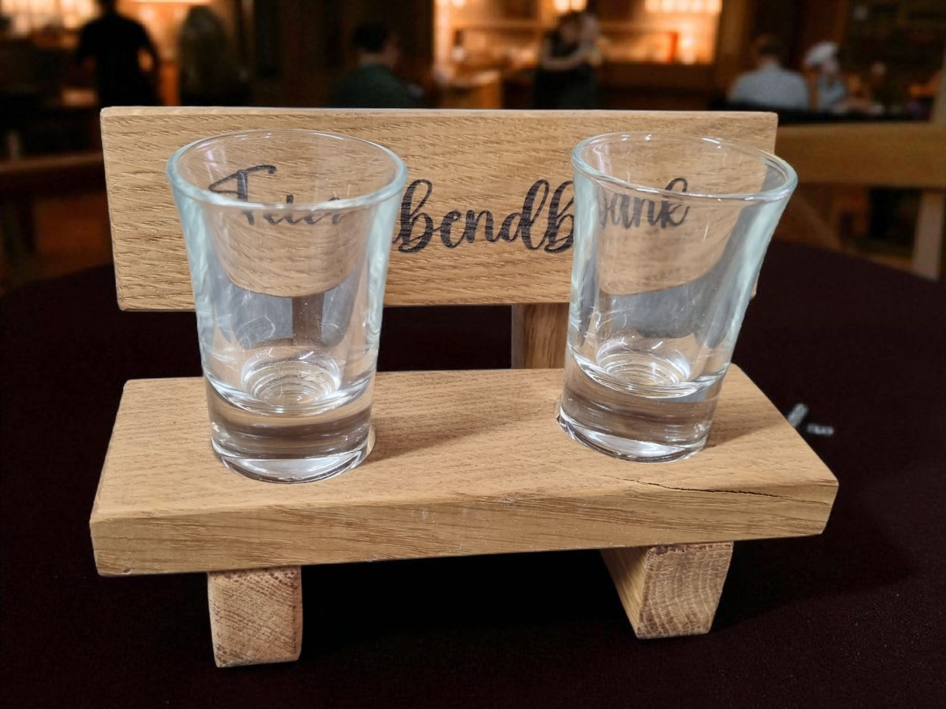 Schnapsbank für 2 Gläser (inklusive) aus Eichenholz mit Lasergravur.