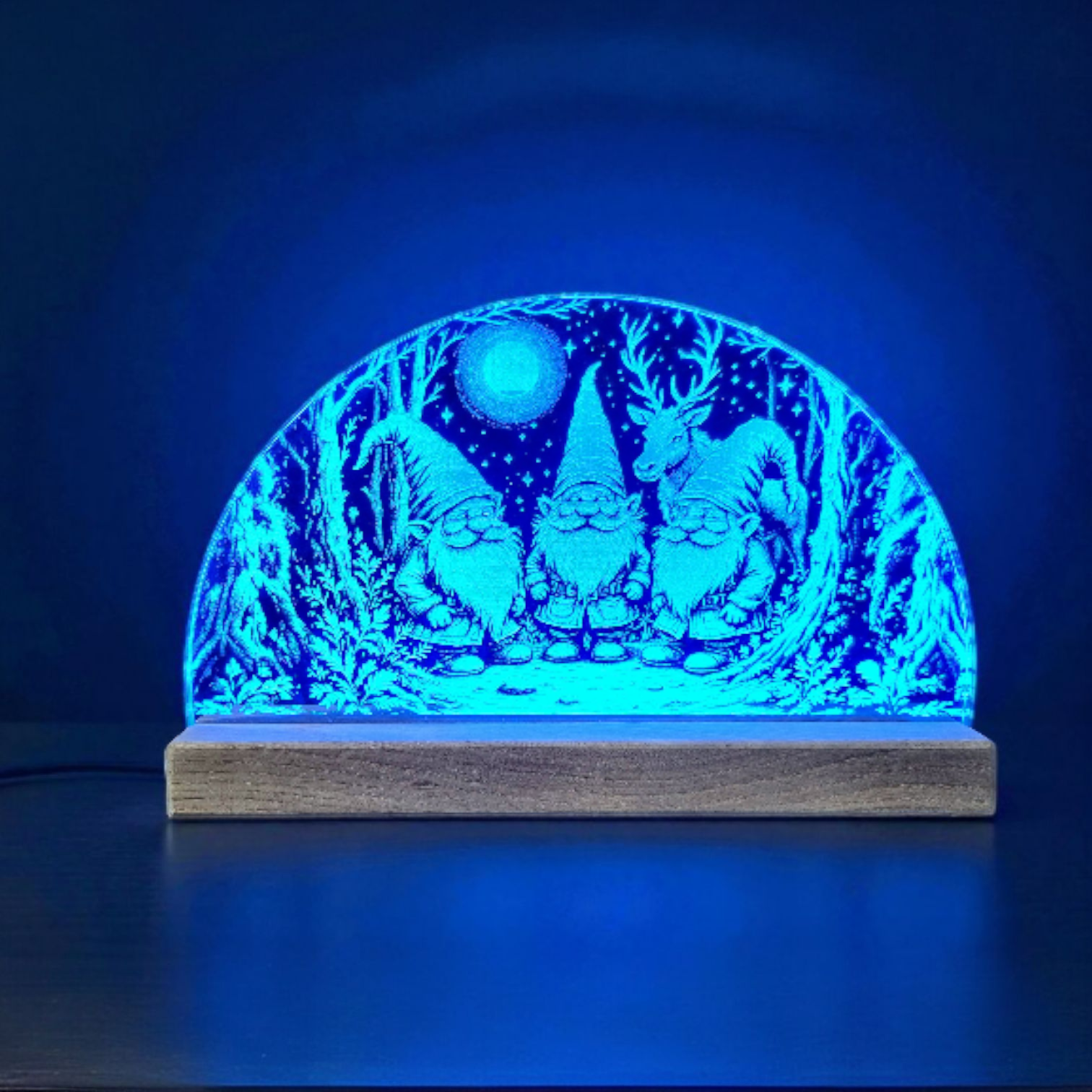 Lichterbogen aus Acrylglas mit eingelasertem Motiv auf einem Eichensockel mit LED Beleuchtung.