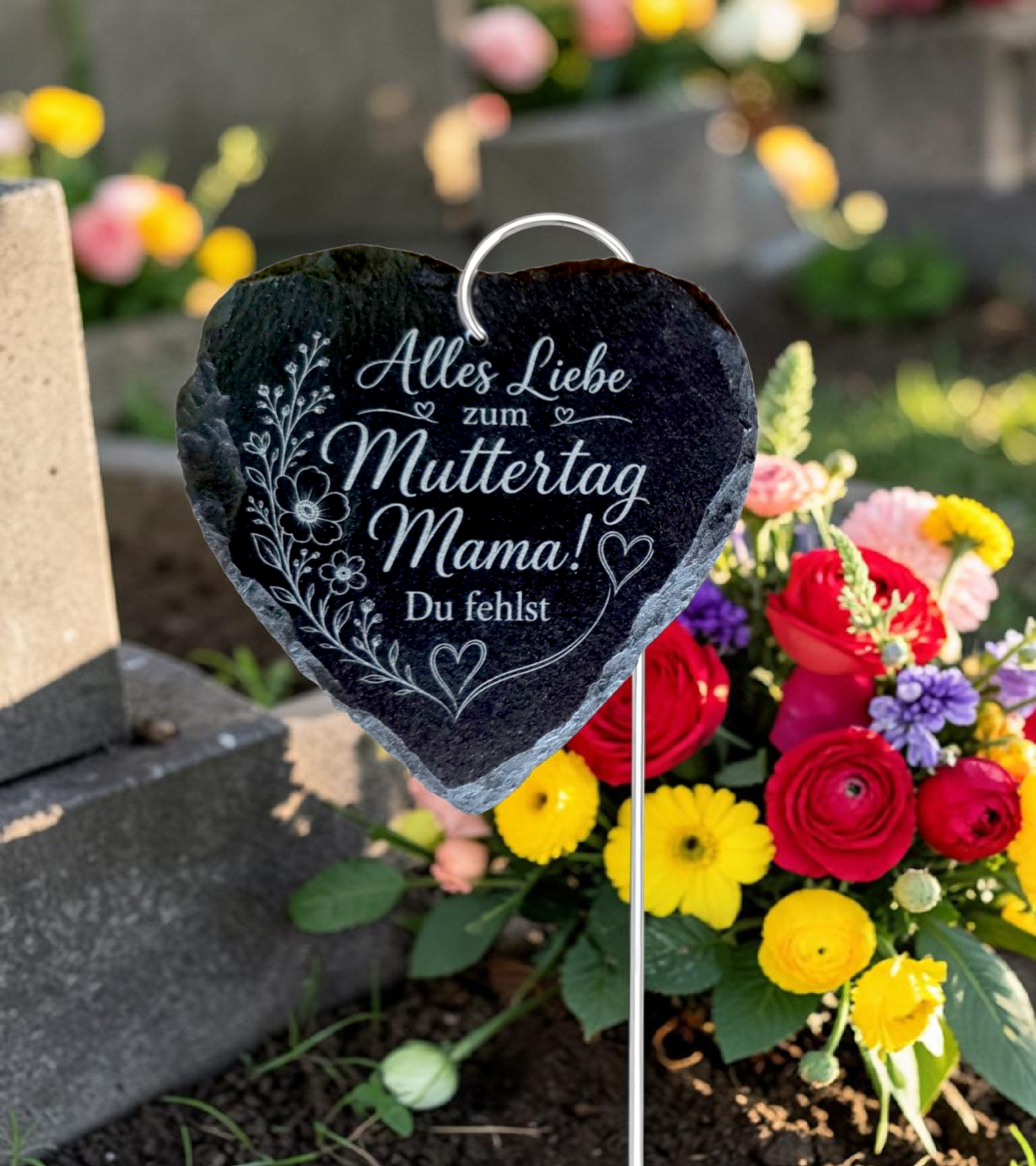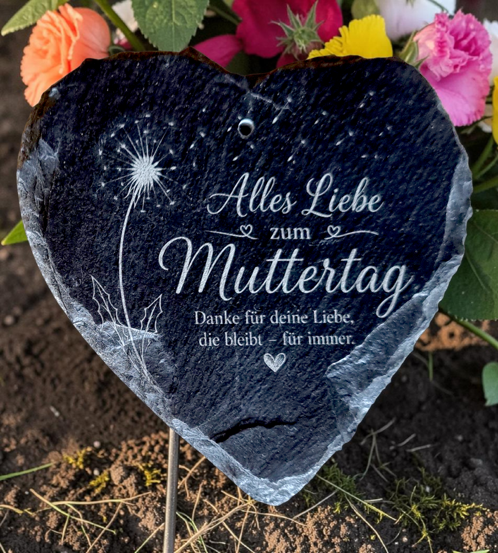 Gelaserte Schieferherzen mit Stab (10 x 10 cm) – liebevolle Grabdekoration zum Muttertag