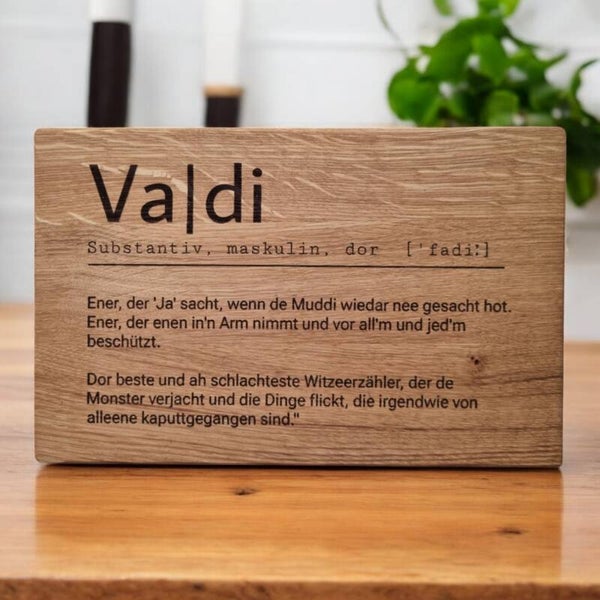Die Gravuren „Muddi“ und „Vadi“ (im charmanten Dialekt-Stil) beschreiben auf witzige und zugleich rührende Weise die Rollen von Mutter und Vater im Alltag: bedingungslose Liebe, Geduld, Schutz und natürlich eine gute Portion Humor.